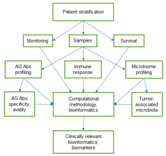 The high-throughput profiling assay for AG Abs, together with microbiota analysis using NGS techniques, can contribute to the development of new non-invasive biomarkers for diagnosis, prognosis, screening, and proper treatment of cancer. However, the identification of universal microbial markers is difficult due to the complexity and high variability of the microbiota composition between individuals [89]. The complex network of multifactorial interactions in cancer, the molecular heterogeneity of tumours, and the individual profile of AG Abs and the microbiome are challenges for population studies and can generate many speculations. Dynamic studies on the relationship between the humoral immune response and the microbiota composition in patients, stratified by tumour pathology, appear to be more relevant for further clinical use (Figure 2). The molecular heterogeneity of malignant tumours, including genomic instability, mutations, and profile of glycosylation, largely predetermines their further development and spread, as well as overcoming the body’s defence mechanisms and the response to therapy [12,140,141]. Commensal microorganisms maintain immune homeostasis and tolerance and can modulate the response to anticancer therapy [74]. Glycomic and microbiome research provide valuable information, but both are in need of unification and analysis that are oriented towards clinical alignment. The computational outputs based on the “multiomics” databases can provide unified bioinformation for monitoring and timely appropriate treatment, and open new opportunities for personalised oncology.