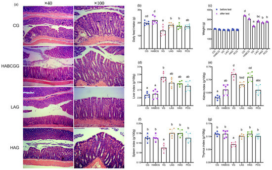 Effect of aloin supplementation on colon tissue (a), the average daily food intake of rats fed AFB1 (b), the body weight (c) and viscera index (d–g) in AFB1-treated rats. CG, control group; HABCG, high-dose aloin blank control group; VG, vehicle group; LAG, HAG, low- and high-dose aloin intervention group; PCG, positive control group (values with different letters represent statistical significance difference among groups, p < 0.05).