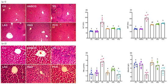 Effect of aloin supplementation on subchronic AFB1-induced liver damage in rats. (a–1) magnification 100×, (a–2) magnification 400×. The liver function indexes were shown in (b–e). CG, control group; HABCG, high-dose aloin blank control group; VG, vehicle group; LAG, HAG, low- and high-dose aloin intervention group; PCG, positive control group; ALT, alanine aminotransferase; AST, aspartate transaminase; TBIL, total bilirubin (values with different letters represent statistical significance difference among groups, p < 0.05).