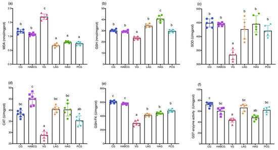 Effect of aloin supplementation on lipid peroxidation (a), antioxidant status (b–e), and hepatic GST (f) in AFB1-treated rats. CG, control group; HABCG, high-dose aloin blank control group; VG, vehicle group; LAG, HAG, low- and high-dose aloin intervention group; PCG, positive control group; MDA, malondialdehyde; GSH, reduced glutathione; SOD, superoxide dismutase; CAT, catalase; GSH-Px, glutathione peroxidase; GST, glutathione-S-transferases (values with different letters represent statistical significance difference among groups, p < 0.05).