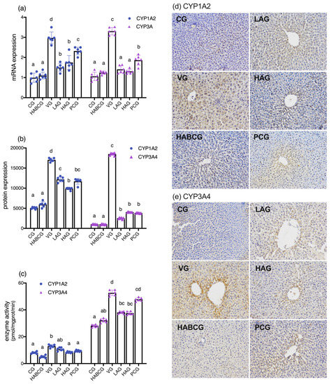 Effect of aloin supplementation on the mRNA expression of hepatic CYP1A2 and CYP3A (a) in rats, representative immunohistochemical photomicrographs for CYP1A2 (d) and CYP3A4 (e) of liver sections (×200), quantitative data of immunohistochemistry for CYP1A2 and CYP3A4 (b), and the effect of aloin supplementation on the enzyme activities of hepatic CYP1A2 and CYP3A4 (c) in rats. CG, control group; HABCG, high-dose aloin blank control group; VG, vehicle group; LAG, HAG, low- and high-dose aloin intervention group; PCG, positive control group; CYP1A2/3A4: cytochrome P450 1A2/3A4 enzyme (values with different letters represent statistical significance difference among groups, p < 0.05).