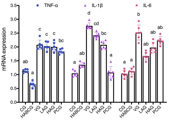 Effect of aloin supplementation on the expression of hepatic TNF-α, IL-1β, and IL-6 in rats. CG, control group; HABCG, high-dose aloin blank control group; VG, vehicle group; LAG, HAG, low- and high-dose aloin intervention group; PCG, positive control group; TNF-α, tumor necrosis factor-α; IL–1β, interleukin-1β; IL-6, interleukin-6 (values with different letters represent statistical significance difference among groups, p < 0.05).