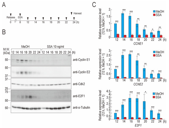 SSA treatment decreases the expressions of cell cycle regulators. (A) Eight hours after release from a double thymidine block, synchronized HeLa S3 cells were treated with MeOH or 10 ng/mL SSA. The cells were then harvested at the indicated time points (black triangles). (B) The protein levels of cell cycle regulators were analyzed using immunoblotting. The protein level of α-tubulin was measured as an internal loading control. (C) The relative expression levels of CCNE1, CCNE2, and E2F1 were analyzed using qRT-PCR. Error bars indicate standard deviation (n = 3). Statistical significance was determined using a two-tailed t-test (* p < 0.05; ** p < 0.01; *** p < 0.001).