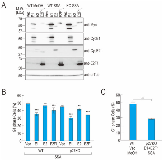 Overexpression of CCNE1 and E2F1 partially suppresses cell cycle arrest. (A,B) HeLa wild-type (WT) or p27 KO cells were transfected with pcDNA3.1-Myc/HIS (Vec), CCNE1-Myc (E1), CCNE2-Myc (E2), or E2F1-Myc (E2F1). The transfected cells were then treated with 10 ng/mL SSA or MeOH for 24 h. The proteins were analyzed using immunoblotting (A), and the cell cycle was analyzed using a cytometer (B). (C) HeLa WT cells or p27 KO cells were transfected with pcDNA3.1-Myc/HIS (Vec) or CCNE1-Myc (E1) and E2F1-Myc (E2F1). The transfected cells were treated with 10 ng/mL SSA or MeOH for 24 h. The cell cycle was analyzed using a cytometer. Error bars indicate standard deviation (n = 3). Statistical significance was investigated using one-way ANOVA and Dunnett’s test (B) or a two-tailed t-test (C) (** p < 0.01; *** p < 0.001).