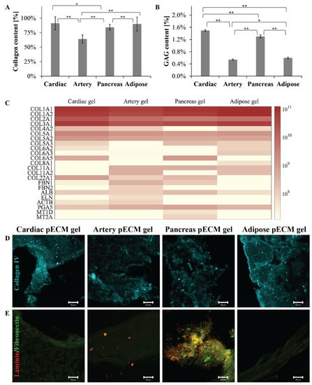 To compare the different pECM hydrogels, we primarily addressed their composition, thus quantifying their most abundant components: collagen and glycosaminoglycans (GAGs). As seen in Figure 1A, all the pECM hydrogels were mainly composed of collagen. Nevertheless, while the arterial pECM hydrogel contained nearly 64% collagen, the collagen content of cardiac, pancreas, and adipose pECM hydrogels was more than 20% higher, ranging between 84% and 91% (p < 0.01). GAGs content was significantly (p < 0.01) higher in the cardiac and pancreas pECM hydrogels (1.50 ± 0.03% and 1.30 ± 0.05%, respectively), compared to the adipose and artery pECM-derived hydrogels (0.60 ± 0.02% and 0.54 ± 0.02%, respectively, Figure 1B). To further address the pECM hydrogels protein composition, a proteomic analysis was conducted, emphasizing that all pECM hydrogels mostly consist of collagen types I, II, and III, with slight variation in their prevalence in each hydrogel (Figure 1C). In particular, a higher content of collagen type I characterized the adipose pECM hydrogel. In the less abundant proteins, however, a unique profile was revealed for each pECM hydrogel. For example, artery pECM hydrogel is the only hydrogel that contains elastin and fibrillin. In the cardiac pECM hydrogel, on the other hand, higher quantities of collagen types V and XXII were detected while collagen type XI was absent. Intriguingly, no collagen type IV was detected in the pancreas pECM hydrogel, though pancreatic ECM is known to contain significant levels of this collagen [13]. Similarly, in none of the hydrogels, we could detect fibronectin or laminin, known ECM components. To test whether these proteins were lost during the hydrogel preparation or whether the proteomic analysis failed to detect them, we further performed immunostaining analyses. These analyses confirmed that all the pECM hydrogels contained collagen type IV (Figure 1D). Fibronectin, on the other hand, was present in the pancreas pECM hydrogel to a significantly larger extent than in the other hydrogels, and laminin could only be detected in the pancreas and artery pECM hydrogels (Figure 1E).