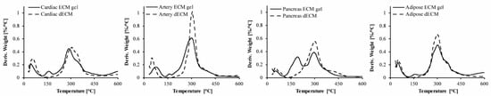 To evaluate the preservation of the pECM components through its processing into hydrogels, we performed thermal gravimetric analysis (TGA) and compared the different decellularized ECMs (dECM) to their respective hydrogels [14,15]. As seen in Figure 2, Table 2, and Figure S1, three degradation steps are obtained for all the pECM samples. The first degradation process starts below 50 °C and is attributed to the loss of bound water. The second degradation process in the hydrogels is seen at ~130 °C and is attributed to the degradation of pepsin, the enzyme that is used for pECM solubilization. The third process that starts at ~230 °C is the most dominant one and is attributed to the degradation of the collagenous components [15]. Overall, our results show minor differences between each hydrogel and the dECM from which it originated, except for the additional step of pepsin degradation. Weight loss derivative analyses enabled determining for each degradation process the initial temperature of the thermal degradation (Tonset), the maximal temperature of the thermal degradation (Tpeak), the temperature in which the degradation was completed (Tendset), and the weight percentage loss during each stage (W). When comparing the different pECM hydrogels, similar thermal decomposition processes were observed, showing residual material below 30%. The second degradation process was the most dominant in the pancreas hydrogel, due to the higher pepsin concentration required for the solubilization of this pECM. For the third degradation process, an earlier onset was seen in the artery pECM hydrogel compared to the pancreas accompanied by a lower endset temperature, compared to the cardiac hydrogel. A higher residue was obtained for the pancreas hydrogel compared to the other pECM hydrogels.
