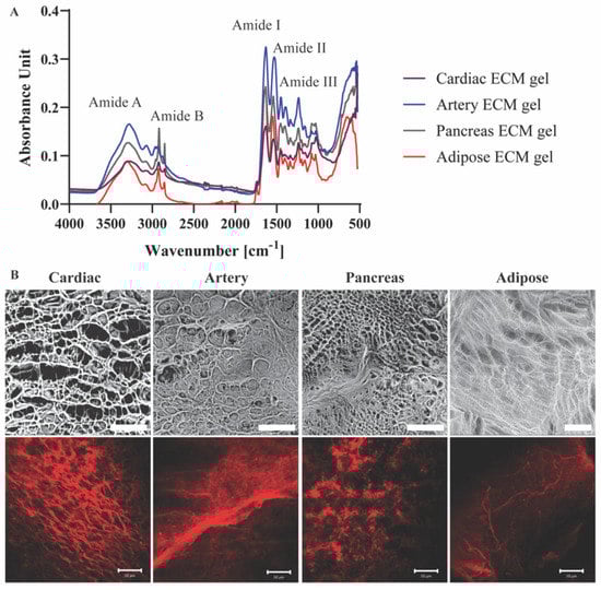 Molecular structures and the presence of characteristic groups, such as amide bonds, sulfates, and sugars in the different pECM hydrogels were addressed using FTIR analyses [14]. The four pECM hydrogels revealed amide vibrations proximal to amide A (~3300 cm−1), amid B (~3100 cm−1), and the three main bands of the collagen fingerprint: amide I (~1650 cm−1) due to carbonyl stretching, amide II (~1550 cm−1) due to combination of N-H in-plane bend, and C-N stretching vibrations, and amide III (~1200 cm−1) due to combination of the C-N stretching vibrations and N-H bending (Figure 3A) [16,17,18,19]. Though no significant differences are evident between each hydrogel and its native dECM (Figure S2), pECM hydrogels derived from different tissues vary in the relative amount of each band, as can be seen from the different peak absorbance ratios (Figure 3A).