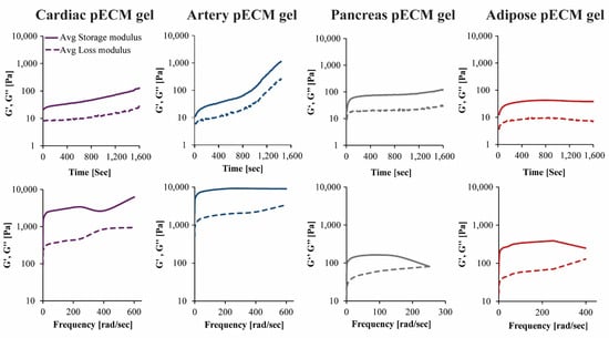 The rheological properties of the different pECM hydrogels were characterized using time and frequency sweep analyses. In the time sweep analyses, measurements were taken while rising the temperature from 4 °C to 37 °C, to enable gelation. Both storage modulus (G′) and loss modulus (G′′) had changed over time. In the hydrogels originating from the pancreas and adipose pECM, gelation had occurred after approximately 4 min, when G′ and G′′ reached a steady state. In the hydrogel originating from cardiac and artery pECM, however, the storage modulus kept rising and did not reach a steady state by the end of the analysis (Figure 4).