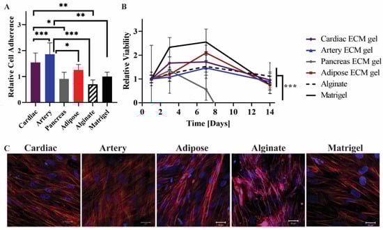 To study the interactions of mesenchymal stem cells (MSCs) with pECM hydrogels from different tissues, we assessed the adhesion, viability, and morphology of the MSCs cultured on the pECM hydrogels. As a control for these experiments, we used alginate and matrigel, common support materials used for cell culture, and tissue engineering scaffolds [21,22,23]. As can be seen from the relative viability detected on the first day, all the hydrogels supported the adherence of MSCs at different levels (Figure 5A). Along the first 7 days of culture, an increase in cell number was observed, leading to constant viability levels until day 14 on most of the pECM hydrogels. On the pancreas pECM hydrogel, however, a decrease in MSCs’ viability was observed until day 7, when almost no viable cells were detected (Figure 5B). Actin staining analysis of the MSCs following 14 days of culture, revealed elongated morphology of the cells under confocal microscopy. Nevertheless, different cell alignment patterns were observed, such as alignment to the same direction in a tissue-like structure on the cardiac pECM hydrogel, a semi-aligned morphology on the adipose tissue pECM hydrogel and the matrigel, and a mesh structure on the artery pECM hydrogel (Figure 5C).