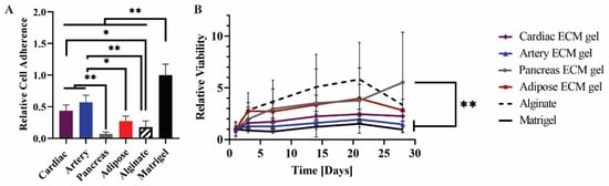 hiPSCs culture on the pECM hydrogels. (A) Cell adherence on the pECM hydrogels, and (B) viability along 28 days of spontaneous differentiation on different pECM hydrogels relative to the viability on each material at day 1 (control). n = 5, * p < 0.01, ** p < 0.001.