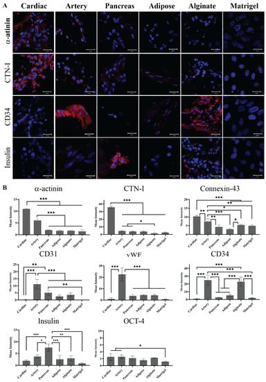The hiPSCs were then seeded on the different pECM hydrogels as well as matrigel and alginate controls. Pluripotency maintenance media was then removed and replaced with media that is known to induce iPSCs spontaneous differentiation, as defined in the Section 4 [26]. As seen in Figure 6A, different adherence rates were obtained on the different hydrogels with the highest rate of adherence to the matrigel and the lowest rate of adherence to the pancreas pECM hydrogel (p < 0.0001). Further, the hiPSCs remained viable on all the hydrogels for at least 28 days (Figure 6B). We then evaluated the expression of markers that are specific for cells residing in the tissues from which the pECMs were originated, to examine whether hiPSCs cultured on the different pECM hydrogels had spontaneously differentiated towards these lineages. Positive immunostaining for the cardiac markers, α-actinin and cardiac troponin I (CTN-I), was observed in the hiPSCs seeded on the cardiac pECM hydrogel and at a lower expression level on the artery pECM hydrogel, but not on the other hydrogels. Similarly, the connexin-43 cardiac marker was mainly stained in the cardiac and artery pECM hydrogels. The endothelial markers CD34, CD31, and Von Willebrand factor (vWF) were all expressed on the artery pECM hydrogel, with lower levels of CD31 expression on the pancreas, adipose, and alginate hydrogels, and a similar level of CD34 expression on the alginate. Insulin was mainly expressed on the pancreas pECM hydrogel (p < 0.001, Figure 7, Figure S4).