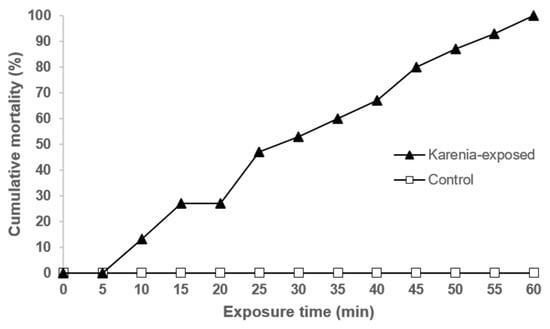 During ichthyotoxicity experiments, critical parameters, including temperature, salinity, pH, ammonia level and dissolved oxygen (DO), were closely monitored throughout the whole period of exposure. All of the above parameters were maintained within acceptable ranges with almost no variation (mean values: temperature = 25.3 °C, salinity = 29.8 g L−1, pH = 8.52, ammonia level = 0.02 mg L−1, and DO = 7.82 mg L−1). Several acute symptoms, including loss of balance, gasping, and blackened body, were observed progressively in some Karenia-exposed medaka within 10 min. Initially, the fish became stressed and moved uneasily, followed by rapid, tilted, and erratic swimming and uncontrolled defecation. Later, they seemed to strive for air by various actions, including swimming vertically towards the surface of water and staying around the air stones connected to the aeration pump. Subsequently, they lost balance, sank to the bottom of the tank in an exhausted manner and lay there. With respect to the physical appearance of the fish, their backbone was blackened and tiny black spots developed on their bodies. Prior to death, the fish became fatigued and moribund and struggled to swim, while their heads turned black in color and their bodies continued twitching. Eventually, the fish’s opercular movement stopped, and they died. The development of toxic symptoms is summarized according to the stage of intoxication and severity (Table S1 in Supplementary Materials). After exposure to K. mikimotoi, the mortality of the medaka reached 100% within 60 min. The response at the selected algal concentration was very acute, and the first death was observed at around 10 min. We recorded the cumulative mortality across the time-course of exposure and determined the lethal times at 25%, 50%, and 90% mortality from the time–mortality curve plotted (Figure 1). Among the untreated medaka, neither fish mortality nor abnormal symptoms were observed throughout the exposure experiments.