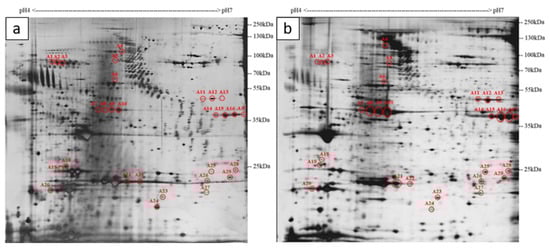Representative two-dimensional gel electrophoresis (2-DE) images of whole-body proteins extracted from (a) K. mikimotoi-exposed medaka with mild-to-moderate symptoms collected at LT25, and (b) untreated medaka. A protein load of 100 µg was separated by isoelectric focusing with a range of pH 4–7 and sodium dodecyl sulfate–polyacrylamide gel electrophoresis in 10% polyacrylamide gel. Silver staining was used. Spots A1–A29 indicate differentially expressed proteins with at least two-fold differences between the two samples.