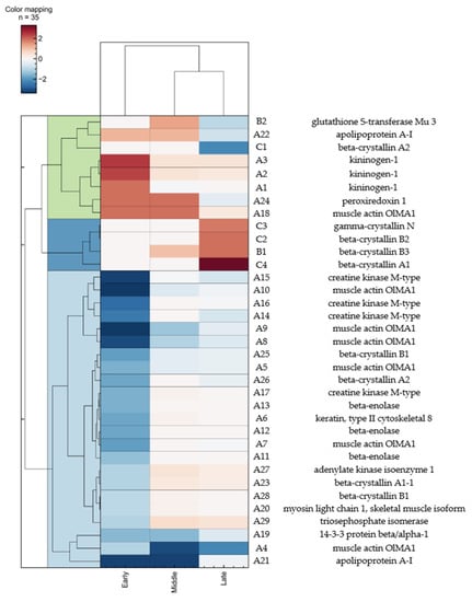 Clustered heat map of differential protein spots on 2-DE images of medaka upon time-dependent exposure to K. mikimotoi. Red and blue colors represent upregulation and downregulation, respectively, while color intensity denotes change on a base-2 log scale. The horizontal axis refers to stages of intoxication, while the vertical axis refers to protein spots. Color labelling on the left shows early upregulated proteins in green, late upregulated proteins in dark blue, and early downregulated proteins in light blue.
