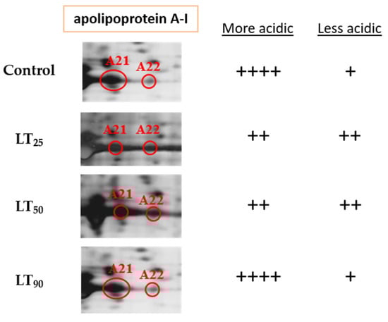 A22 | 5.66 | 30 | apolipoprotein A-I | gi|327358583 | 85 | 42 | +2.2 | +2.2 | −1.6 |