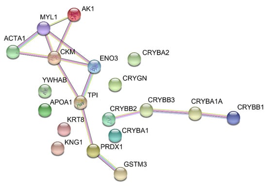 STRING protein–protein association network analysis of 19 identified differentially expressed medaka proteins upon exposure to K. mikimotoi. Light blue and pink edges represent known interactions obtained from curated database and experiments, respectively, while yellow, black, and purple edges represent protein association by textmining, co-expression, and homology, respectively. Proteins starting with codes in parentheses represent muscle actin (ACT), myosin light chain (MYL), adenylate kinase (AK), creatine kinase (CK), enolase (ENO), triosephosphate isomerase (TPI), peroxiredoxin (PRDX), glutathione S-transferase (GST), 14-3-3 protein (YWHA), apolipoprotein (APO), keratin (KRT), kininogen (KNG), and crystallin (CRY).