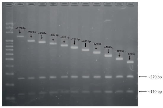 For each isolate, we performed CRISPR-RFLP with the restriction enzyme DdeI. The resulting restriction fragments were separated according to length by gel electrophoresis (Figure 1). After RFLP and electrophoresis, all PCR results of CRISPR1 from these GBS isolates showed three bands, with lengths of CRISPR1 sequences ranging from 140 to 1250 bp. The common 140 and 270 bp fragments were part of the type II-A CRISPR-associated protein and hypothetical protein, respectively. Among all GBS isolates, a total of 11 different gel band patterns were detected by CRISPR-RFLP (Table 1). Because previous studies showed that GBS isolates with the same RFLP pattern may contain similar CRISPR spacer compositions [21], the CRISPR compositions of all isolates were sequenced and analyzed to document this phenomenon. In addition, the PCR products of CRISPR-RFLP were sequenced, and we found that GBS isolates with the same RFLP pattern also had similar spacer compositions (Table 1). Most of the spacers were identified in previous studies, and the same represented numbers were coded [23]. We found that 82 out of 103 (79.6%) GBS isolates contained seven spacers in a conserved order (101, 102, 49, 53, 54, 55, and 56). A total of 18 new spacers were found in this cohort, submitted to GeneBank, and assigned as S1 to S18. We found that all of the newly identified spacers were in GBS strains with larger-molecular-weight CRISPR-RFLP bands. In addition, it is well-known that new spacers are inserted at the 5′ end of the array in most cases, and we suggest that these spacers may have been acquired recently after verification by checking the positions of the spacers.