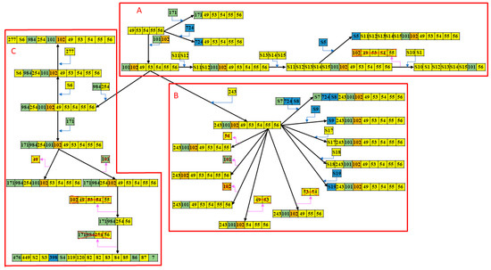Phylogenetic relationship of 103 CRISPR-positive GBS strains constructed on 43 CRISPR types based on eBURST analysis. All 103 CC17/III GBS isolates can be categorized into three major subgroups (A–C) based on the CRISPR-RFLP array and eBURST analysis. The differences between compositions of CRISPR and gain or loss of spacers are marked and their relationships are presented.