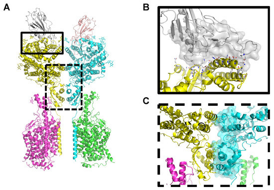 Interfaces targeted by designed peptides in the case of SARS-CoV-2 RBD and full length ACE2. (A) Cartoon representation of full length human ACE2 (yellow, cyan)/BoAT1 (magenta, green) and RBD (grey, pale pink). (B,C) Interface targeted by peptides where (B) shown and enlarged view of the interface between ACE2 (yellow, cartoon) and RBD (grey, surface) and (C) and enlarged view of the interface between ACE2 monomers (yellow and cyan).