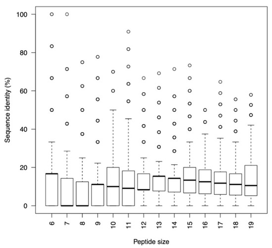 Given the structural similarity between both RBDs, the interface targeted in the case of SARS-CoV (Supplementary Figure S1) has similar features to that of SARS-CoV-2 (Figure 1). This fact is reflected not only on a comparable area of their respective interfaces but also in the number on interface or anchor residues. The sequences of the peptides designed to target both surfaces were however quite different. As shown in Figure 2, the distribution of sequence identity of 10,000 peptide pairs with size ranging from 6 to 19 that were chosen randomly was very low. Even in the case of short peptides and besides outliers, the average sequence identity of any given pair was below 20% decreasing as the size of peptides increase. This is an important observation that show that even though both RBD in SARS-CoV and SARS-CoV-2 shared an important structural similarity and do target the same receptor, ACE2, the interface presents unique features that could be exploited by developing specific peptides.