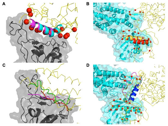 Structural model of the peptides targeting RBD and ACE2 dimerization interfaces. Panels A and C shows structural model of several peptides designed to target SARS-CoV-2 RBD in cartoon representation recapitulating native elements of the interface (A) or presenting novel conformations (C). RBD is shown in grey and cartoon and surface representation while ACE2 is shown as a trace of C-alpha (yellow); anchor residues are shown as red spheres. Panels B and D show the structural models of peptides targeting ACE2 dimerization in cartoon representation also recapitulating native elements (B) or new conformations (D). ACE2 is presented both in cartoon and surface (cyan) and as a trace of C-alpha (yellow); anchor residues are shown as red spheres.