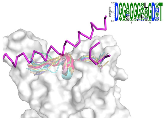 Structural ensemble of peptides targeting a common region of the target surface. RBD of SARS-CoV-2 S protein is shown in white and surface representation while the H1 helix of ACE2 is shown in magenta and ribbon. The different designed peptides are shown in different colours and translucent cartoon representation. A web logo [33] depicting the conservation is shown in the top right side.