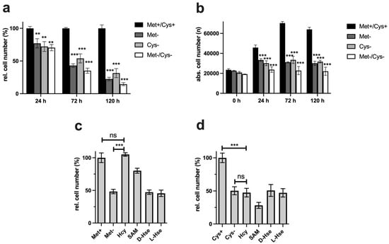 For this purpose, cells were incubated for five days with complete medium (Met+/Cys+), cysteine-(Met+/Cys-), or methionine-free (Met-/Cys+) medium, or, for the control, in medium missing both amino acids (Met-/Cys-). After one, three, and five days, the cells were analysed via crystal violet staining, and the relative cell numbers were determined (Figure 1a).