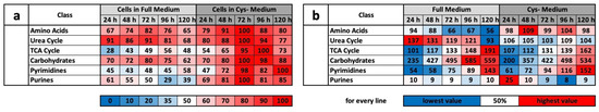 A summary of the groups shows intracellular results, which are presented in the following detailed examination of the individual metabolites. Namely, at almost every point in time, the concentrations of most metabolites under CysR were higher than those in the control. Since CysR inhibited proliferation (Figure 1a,b) and reduced metabolism is assumed, a large number of metabolites seem to accumulate within the cell. While there were smaller differences for amino acids and the urea cycle, the differences in the other groups were even clearer. The TCA cycle deserves special mention. Under metabolically active conditions, this is one of the most stressful cycles. Precisely because its intermediates are precursors for a large number of metabolites (e.g., amino acids and glucose), the cycle is also of enormous relevance for cancer cells [25]. Under CysR, the concentrations were increased by approximately two-fold compared to those of the control (Figure 2a). In the medium, on the other hand, the profiles are quite similar for most groups. For the urea cycle, slightly increased amounts were seen in the control in the first 96 h. The most striking difference was seen in the amino acids. The amino acid content in the medium continuously decreased in the control, i.e., the cells took up amino acids, but the total concentration under CysR remained relatively constant (Figure 2b).