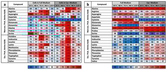 Heat map of essential and nonessential proteinogenic amino acids. LC/MS analyses were carried out in two independent experiments at 24, 48, 72, 96, and 120 h, with each value obtained from triplicate measurements. The heat map shows the summarized results. For the (a) cell pellets, the highest measured value in the test series was defined as 100%. For the values of the (b) media, the control measurement of the medium was defined as 100%.