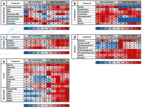 Heat map of metabolites associated with pathways/groups. LC/MS analyses were carried out in two independent experiments at 24, 48, 72, 96, and 120 h, with each value obtained from triplicate measurements. The heat map shows the summarized results: (a) methionine salvage pathway, (b) “S” (ulfur) metabolism, (c) Gly(cerine) metabolism, (d) glycolysis and (e) purines and nicotinamides. For the cell pellets, the highest measured value in the test series was defined as 100%.