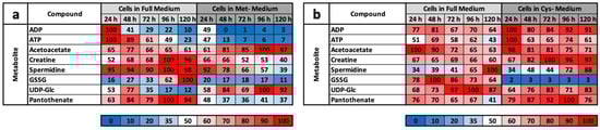 LC/MS analyses were carried out in four independent experiments at 24, 48, 72, 96, and 120 h, with each value obtained from triplicate measurements. Metabolites were quantified in cell pellets and corresponding supernatants (media) under methionine-supplemented and methionine-free conditions (12 samples per time point in total). The resulting peak areas were normalized against lamivudine as an external standard. From this, the mean value and standard deviation were calculated for each triplicate. For better comparisons, the values were converted to percentages. For the values of the media, the control measurement of the medium used was defined as 100%. For the cell pellets, the highest measured value in each test series within an experiment was defined as 100%. From these values, the average mean values from the four experiments were then summarized in the individual tables. For a better overview, the results were rounded to natural numbers and shown as a heat map. The corresponding colour range is indicated individually under each table.