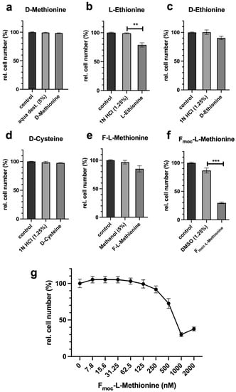 Analysis of proliferation inhibition by D-forms or potential analogues of methionine and cysteine. A total of 10,000 cells were seeded per well, incubated overnight, and stimulated for 72 h in complete medium with or without a 50× or 100× excess (values are given in brackets) of analogue or D-amino acid depending on the concentrations of methionine and cysteine and the toxicity of the solvent. The proliferation of the cells was analysed by crystal violet staining as described in the Materials and Methods. (a) The figures show a summary of the results obtained from two independent experiments (five values for every group per experiment). A control was full medium, and a second control was the solvent at the same concentration as in the probe with D-amino acid or analogue. (a) D-methionine (100×), (b) L-ethionine (100×), (c) D-ethionine (100×), (d) D-cysteine (50×), (e) formyl-L-methionine (F-L-methionine) (100×), and (f,g) Fmoc-L-methionine (100×). Comparison between different groups was done by applying one-way ANOVA test followed by the Tukey–Kramer multiple comparison test. (ns; nonsignificant, ** p < 0.01, *** p < 0.001).