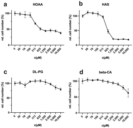 Basically, AR is difficult to implement as a therapy. For food intake, the amino acid in question can be removed only with difficulty and usually only reduced (and in a not clearly specific and standardized range). As already mentioned, cysteine offers the possibility of suppressing the synthesis of the amino acid from methionine by inhibiting the enzymes CBS and/or CSE. Numerous inhibitors have already been described in the literature [19]. In this work, we decided to analyse hydroxylamine-O-acetic acid (HOAA), hydroxylamine solution (HAS), DL-propargylglycine (DL-PG), and beta-cyano-L-alanine (beta-CA) to test the potential of the substances to inhibit proliferation in L929 cells (Figure 7a–d). HOAA and HAS were effective inhibitors with IC50 values of approximately 500 and 300 µM. However, HAS was most effective, as proliferation was reduced to up to 20%. DL-PG and β-CA showed only slight antiproliferative effects at very high concentrations.