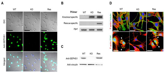 Construction of Sephs1 knockout and rescue 2H11 endothelial cancer cells. Confirmation of Sephs1 knockout by (A) immunocytochemistry (Scale bars represent 100 μm) and by (B) RT-PCR (the knockout-specific and rescue-specific primer sets are described in Materials and Methods) or (C) Western blot analysis. Hprt and anti-vinculin were used as internal controls. (D) Immunostaining of cytoskeletons and focal adhesion. Red and green color designate F-actin and α-tubulin, respectively (upper panel). In the lower panel, F-actin is in red and FAK in green. Arrowheads in the lower panel designate focal adhesion. Since most FAK is overlapped with F-actin, it appears as a yellow color. Scale bars represent 50 μm. DIC, digital image correlation; WT, wild type; Res, rescue; KO, knockout; FAK, focal adhesion kinase.
