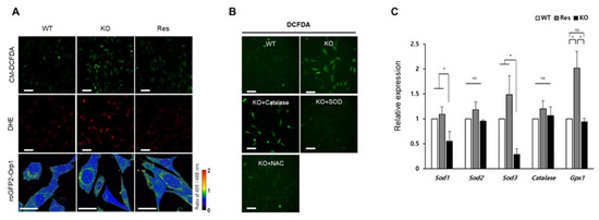 Identification of ROS type accumulated in Sephs1-knockout 2H11 cells. (A) Cells were stained with CM-DCFDA for general ROS and DHE for superoxide, and hydrogen peroxide levels were measured using roGFP2-Orp1 probe. The ratio between oxidized Orp (405 nm) and reduced Orp (488 nm) was calculated as described in Materials and Methods. Scale bars represent 100 μm for CM-DCFDA and DHE, and 50 μm for roGFP2-Orp1, respectively. (B) Confirmation of superoxide accumulation by treatment of scavengers. Scale bars represent 100 μm. (C) Measuring expression levels of ROS-scavenging enzymes by real-time PCR. The primers used in this experiment are shown in Table S1. NS, and * indicate not significant, and p-value < 0.05, respectively. WT, wild type; Res, rescue; KO, knockout.
