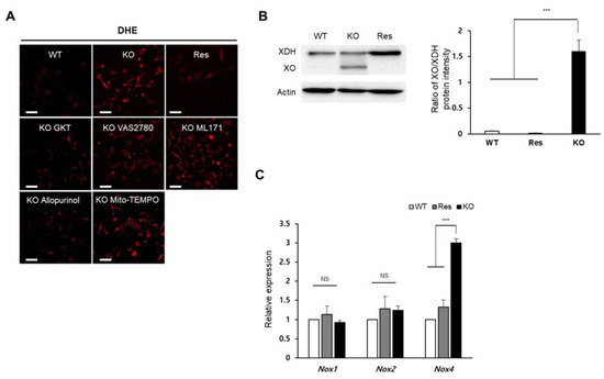 To identify which synthesis pathway contributes to the accumulation of superoxide in the Sephs1-knockout 2H11 cells, cells were treated with chemicals that inhibit individual pathways, and superoxide levels were observed using DHE staining. As shown in Figure 3A, the addition of allopurinol (XO inhibitor) and GKT137831 (NOX1 and 4 inhibitor) decreased superoxide levels in Sephs1-knockout cells near to those levels observed in wild-type control cells (see also Figure S3). However, the treatment with VAS2780 (NOX2 inhibitor), ML171 (NOX1 inhibitor) or Mito-TEMPO (mitochondrial superoxide scavenger) did not reduce superoxide levels. These results suggest that XO and NOX4 are the major sources of superoxide production in Sephs1-knockout endothelial cells. The increase in superoxide levels caused by XO can be achieved by increasing the expression of XO. Generation of XO, which is produced by cleaving xanthine oxidoreductase (XOR), was dramatically induced by Sephs1 knockout (Figure 3B). In Sephs1-knockout cells, the ratio between XOR and XO was approximately 1, while the XO form was not detectable in wild-type control and rescue cells. Although GKT137831 is an inhibitor of both NOX1 and NOX4, only Nox4 mRNA levels were increased significantly by Sephs1 knockout (Figure 3C). These results indicate that superoxide accumulation in Sephs1-knockout cells occurs both by a reduction in superoxide scavengers and by an increase in superoxide-producing enzymes such as XO and NOX4.
