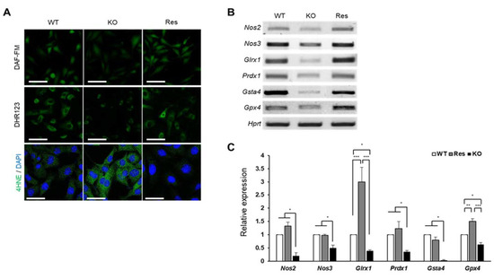 Effect of SEPHS1 deficiency on reactive nitrogen species generation and lipid peroxidation in 2H11 cells. (A) Staining of cells with fluorescent dyes to detect nitric oxide (DAF-FM), peroxynitrite (DHR123), and lipid peroxidation (4HNE). Scale bars in DAF-FM and DHR123 represent 100 μm, and 50 μm in in 4HNE. (B) Measuring expression levels of redox regulators participating in RNS generation and lipid oxidation by RT-PCR and (C) real-time PCR. *, ** and *** indicate p-value < 0.05, 0.01 and 0.001, respectively. The primers used in this experiment are shown in Table S1. WT, wild type; Res, rescue; KO, knockout.