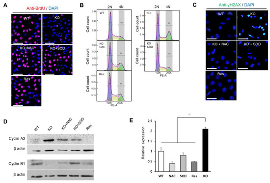 Cell cycle analysis was performed by measuring DNA content after staining cells with propionic iodide (PI) [37]. Cells were seeded onto a 12-well plate at a density of 3 × 104 cells/well. After a 12 h incubation, ROS scavengers such as SOD or NAC were administered into Sephs1-knockout cell overnight. On the following day, cells were harvested, washed once with PBS, and fixed in 70% ethanol at 4 °C overnight. The fixed cells were washed with PBS twice, resuspended with PBS containing RNase A (200 µg/mL) and incubated for 10 min at room temperature. Cells were then further incubated with 100 µg/mL of PI in PBS for 30 min at room temperature. Stained cells were analyzed using FACS (Canto II, BD Biosciences) and FlowJo software.