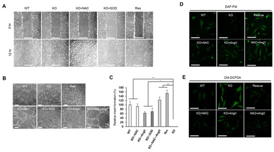 Because endothelial cells are the main cell type of blood vessels, dysfunction of endothelial cells will cause the loss of angiogenic ability of an organism. Excessive ROS have been known to inactivate NO by oxidoreduction, and the reduction of NO causes endothelial dysfunction [27]. As described in the previous sections, the targeted removal of Sephs1 in endothelial cells led to growth inhibition, reduction in focal adhesion, ROS accumulation and reduction in RNS levels. We, therefore, examined whether SEPHS1 deficiency affects the ability of endothelial cells to carry out angiogenesis. Cell migration is one of the important characteristics of angiogenesis. Wound healing is often used to measure migration ability of cells. As shown in Figure 6A, Sephs1 knockout caused significant reduction in the endothelial cells wound-healing ability in scratch-wound assays. The wound-healing ability was reduced by approximately 2-fold in Sephs1-knockout cells compared to that in wild-type cells after 12 h incubation (Figure S6A). Both Sephs1-rescue- and ROS-scavenger (NAC and/or SOD)-treated Sephs1-knockout cells recovered wound-healing abilities with similar levels to those observed in wild-type 2H11 cells. This suggests that inhibition of wound-healing ability in Sephs1-knockout cells is mediated by superoxide accumulation. Future experiments to determine whether this inhibition of wound healing was due to the loss of migration ability or the inhibition of proliferation will require additional control experiments using a proliferation inhibitor such as aphidicolin.
