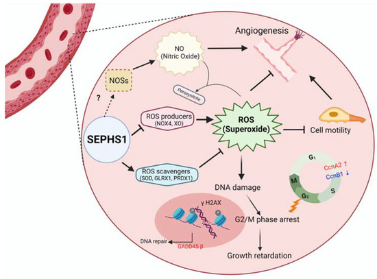 A schematic model for SEPHS1 function in mammalian endothelial cells. The cell represents an endothelial cell in the blood vessel. In normal conditions, SEPHS1 expresses ROS scavengers at appropriate levels, but inhibits superoxide generators such as NOX4 and XO. Superoxide is accumulated when SEPHS1 is deficient, and the superoxide causes endothelial cell dysfunctions such as growth retardation by G2/M phase arrest and loss of angiogenic ability by a decrease in NO levels. NO levels are decreased by downregulation of NOSs. Oxidative stress by superoxide accumulation leads to DNA damage and then G2/M phase arrest. The mechanism of how SEPHS1 inhibits the expression of NOSs is unclear. Arrows (→) designate activation and barred-lines (⊥) designate inhibition.