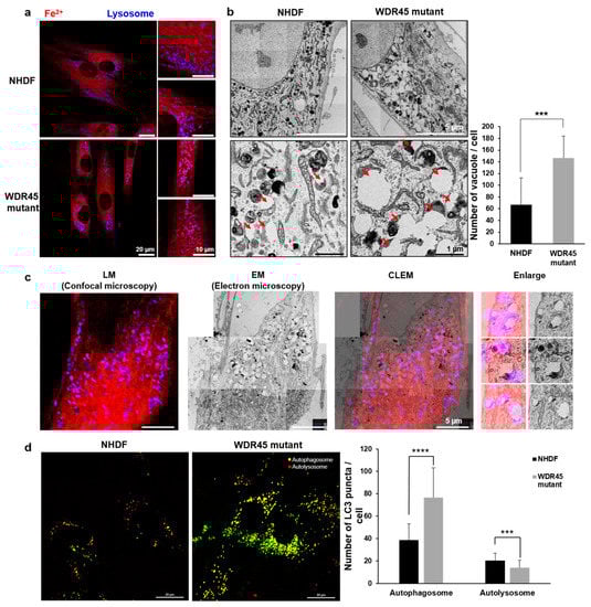 WDR45 mutant fibroblasts from the patient, and slight iron accumulation was observed in the mitochondria possessing the c.974-1G>A mutation. Iron accumulation can lead to ROS production, the generation of oxidative stress, dysfunction of the mitochondria, and abnormal autophagy. To investigate the structural and functional changes in autophagy and mitochondria caused by iron accumulation, such changes were measured using confocal microscopy, electron microscopy, and gene expression profiling analysis.