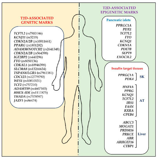 Genetic and epigenetic marks associated with type 2 diabetes. Showing some of the genetic variants (rs or RefSNP) and differentially DNA-methylated genes identified as associated with type 2 diabetes in humans. rs, reference single nucleotide polymorphisms; SK, skeletal muscle; AT, adipose tissue; T2D, type 2 diabetes.