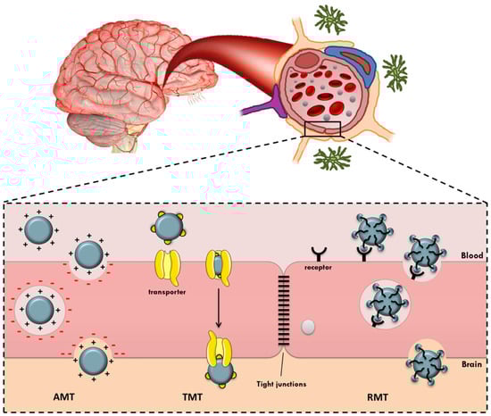 Schematic representation of the different mechanisms of nanoparticles for crossing the blood–brain barrier (BBB). AMT, adsorptive-mediated transcytosis; TMT, transporter-mediated transcytosis; RMT, receptor-mediated transcytosis.