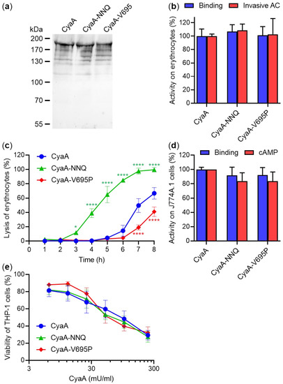 Figure 1. CyaA variants with selectively increased or decreased pore-forming (hemolytic) activity retain full cAMP-elevating capacity when secreted from B. pertussis. (a) B. pertussis Tohama I and its mutant variants were grown in liquid SS medium for 20 h at 37 °C and the CyaA toxin variants were detected on a Western blot of bacterial lysates using the 9D4 monoclonal antibody recognizing the C-terminal RTX domain of CyaA. (b) Sheep erythrocytes (5 × 108/mL) were incubated at 37 °C with 0.2 U/mL of the CyaA variants purified on calmodulin-Sepharose beads and after 30 min, aliquots were taken for determination of the cell-associated AC enzyme activity (binding) and of the AC enzyme activity internalized into erythrocytes (invasive AC). The activity of intact CyaA was taken as 100%. Each bar represents the mean value with the standard deviation (SD) of three (binding) or four (invasive AC) independent experiments (p-value > 0.05; ANOVA). (c) Hemolytic activity was measured upon incubation of sheep erythrocytes with 0.2 U/mL of the CyaA variants as the amount of released hemoglobin by photometric determination (A541). Each point represents the mean value ± SD of at least three independent experiments. Significant differences between the mean values of hemolytic activities of intact CyaA and its mutant variants are shown (* p < 0.05; **** p < 0.0001; ANOVA). (d) Binding of the CyaA variants to J774A.1 cells (1 × 106) was determined as the amount of cell-associated AC enzyme activity upon incubation of cells with 0.2 U/mL of the CyaA variants for 30 min at 4 °C. cAMP intoxication was assessed by determining the intracellular concentration of cAMP generated in cells after 30 min of incubation of J774A.1 cells (1.5 × 105) with 32, 16, and 8 mU/mL of the CyaA variants. The activity of intact CyaA was taken as 100%. Each bar represents the mean value with SD of three independent experiments (p-value > 0.05; ANOVA). (e) Cell viability of CyaA-treated THP-1 cells (1.5 × 105/well) was determined as the capacity of mitochondrial dehydrogenases to reduce the tetrazolium salt WST-1 to its formazan product after 2 h at 37 °C. Each point represents the mean value ± SD of at least three independent experiments (p-value > 0.05; ANOVA).