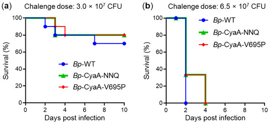 At the challenge dose of 3 × 107 colony forming units (CFU), approximately 20% of the infected mice died within 3 (Bp-WT and Bp-CyaA-NNQ) or 4 (Bp-CyaA-V695P) days from intranasal infection (Figure 2a). An additional 10% of mice challenged with Bp-WT died on day 7. When an increased challenge dose of 6.5 × 107 CFU was administered, all infected mice died within 2 (Bp-WT) or 4 (Bp-CyaA-NNQ and Bp-CyaA-V695P) days (Figure 2b). The calculated LD50 values for Bp-WT (~3 × 107 CFU/mouse), Bp-CyaA-NNQ (~1.8 × 107 CFU/mouse), and Bp-CyaA-V695P (~2.6 × 107 CFU/mouse) were not statistically significantly different. Hence, the selective increase or decrease of the specific pore-forming activity of the secreted CyaA variants did not affect the overall virulence of B. pertussis in the mouse pneumonic infection model any importantly, and the mutants secreting the CyaA-NNQ and CyaA-V695P variants caused a comparably lethal course of infection in mice.