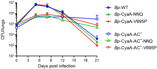 To corroborate this observation, the capacity of the mutants to proliferate in mouse lungs was compared to that of the parental B. pertussis strain using a sublethal infection dose. BALB/cByJ mice were intranasally inoculated with 50 µL of suspensions containing ~1 × 105 CFU/mouse of Bp-WT or its mutant derivatives Bp-CyaA-NNQ and Bp-CyaA-V695P and lung colonization course was followed for 21 days. Mice were sacrificed by cervical dislocation at 2 h and 5, 8, 12, and 21 days after infection, the lungs were aseptically removed, homogenized in physiological salt solution, and serial dilutions of lung homogenates were plated on Bordet–Gengou agar plates for B. pertussis CFU determination after 72 h of incubation at 37 °C. As shown in Figure 3, the Bp-CyaA-NNQ and Bp-CyaA-V695P mutant strains colonized the lungs of mice as efficiently as the parental Bp-WT strain, exhibiting an increase in CFU counts in the lungs by almost two orders of magnitude at the peak of infection 5 days after challenge (~7 × 106 CFU/mouse). The CFU counts of all three B. pertussis strains then gradually decreased with a similar time course to a value of ~1 × 103–4 × 104 CFU/mouse on day 21. These results demonstrated that despite a substantial difference in the specific pore-forming activity of the secreted CyaA toxin, the CyaA-NNQ and CyaA-V695P variants supported the capacity of B. pertussis to multiply and persist in mouse lungs to the same extent as intact CyaA.