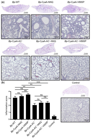 Figure 4. Selective increase of the pore-forming activity of CyaA has no effect on pathology and inflammation of B. pertussis infected lungs. Three BALB/cByJ mice per group were infected intranasally with 2 × 105 CFU of the WT and mutant B. pertussis strains. Mice were sacrificed on day 7 and lung sections were processed and stained with H&E. Control mice received SS medium only. (a) Scanned longitudinal sections of the left lobes that are representative of six serial sections per lung lobe. The bottom panels show enlargements of representative images of the bronchi and peribronchial parenchyma taken by a light microscope at a magnification of 10×. Lungs of mice infected by the group of B. pertussis strains secreting enzymatically active CyaA toxin variants (Bp-WT, Bp-CyaA-NNQ and Bp-CyaA-V695P) exhibited bronchopneumonia affecting the regions primarily around the large lobar bronchi. Substantially milder inflammation was observed in the lungs of mice infected by the group of B. pertussis strains producing enzymatically inactive CyaA-AC toxoid variants (Bp-CyaA-AC, Bp-CyaA-AC-NNQ, and Bp-CyaA-AC-V695P). (b) Quantification of H&E stained slides was performed manually by the inflammation score 0–4 (0—no inflammation; 1—1–25% inflammation; 2—26–50% inflammation; 3—51–75% inflammation; 4—76–100% inflammation) that was calculated as the ratio of the total inflammatory lesion area to the total area of each lung section on 6 consecutive lung sections for 3 infected mice per group (18 sections analyzed in total; ** p < 0.01; *** p < 0.001; ns, not significant; ANOVA).