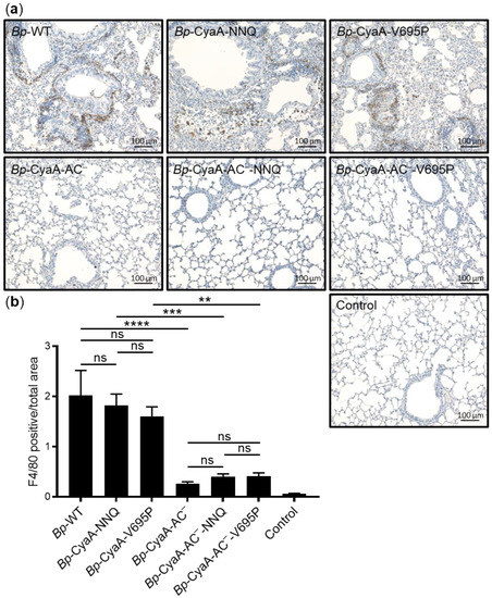 Figure 5. Selective enhancement of the pore-forming activity of CyaA does not affect macrophage recruitment into B. pertussis infected lungs. Three BALB/cByJ mice per group infected intranasally with 2 × 105 CFU of the WT and mutant B. pertussis strains were sacrificed on day 7 and the sections of lung tissue were examined upon F4/80 immunohistochemical staining for macrophages. (a) Representative lung sections were inspected by light microscopy at a magnification of 10× and infiltration of macrophages in the B. pertussis-induced lesions was assessed. Substantially lower macrophage infiltration was observed in the lungs of mice infected by the group of B. pertussis strains producing enzymatically inactive CyaA-AC toxoid variants (Bp-CyaA-AC, Bp-CyaA-AC-NNQ, and Bp-CyaA-AC-V695P) than in the lungs of mice infected by B. pertussis strains secreting enzymatically active CyaA toxin variants (Bp-WT, Bp-CyaA-NNQ, and Bp-CyaA-V695P). (b) Quantification of F4/80-stained macrophages was performed by an automated evaluation for positive pixel count for DAB using the QuPath software on 6 consecutive lung sections for 3 infected animals per group (18 sections analyzed in total; ** p < 0.01; *** p < 0.001; **** p < 0.0001; ns, not significant; ANOVA).