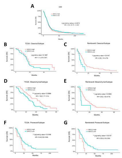 NR3C2 expression and clinical outcome in GBM subtypes. Kaplan-Meier analysis of (A) GBM TCGA patient cohort. Differences in overall survival for patients with high (n = 263) or low (n = 262) expression of NR3C2 are shown. (B) TCGA Classical subtype patient cohort. Differences in overall survival for patients with high (n = 14) or low (n = 55) expression of NR3C2 are shown. (C) Rembrandt Classical subtype patient cohort. Differences in overall survival for patients with high (n = 53) or low (n = 10) expression of NR3C2 are shown (D) TCGA Mesenchymal subtype patient cohort. Differences in overall survival for patients with high (n = 49) or low (n = 49) expression of NR3C2 are shown (E) Rembrandt Mesenchymal subtype patient cohort. Differences in overall survival for patients with high (n = 54) or low (n = 5) expression of NR3C2 are shown (F) TCGA Proneural subtype patient cohort. Differences in overall survival for patients with high (n = 11) or low (n = 48) expression of NR3C2 are shown (G) Rembrandt Proneural subtype patient cohort. Differences in overall survival for patients with high (n = 7) or low (n = 52) expression of NR3C2 are shown Hazard ratio and p (log-rank) are indicated. * p < 0.05, ** p < 0.01. Datasets were obtained and analyzed using the GlioVis data portal [16].