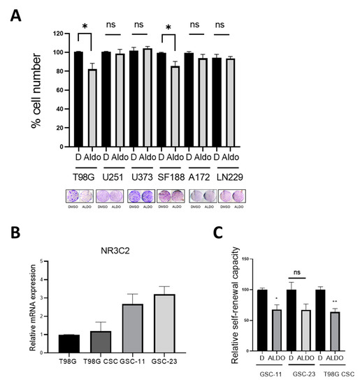 GSCs represent a subpopulation of slow-cycling cells with self-renewal capacity characterized by increased radio- and chemotherapy resistance [17]. They have the potential to withstand therapy and promote recurrent tumor growth [18,19,20]. MR expression was detectable in T98G-derived CSCs (cancer stem cells) and was comparable to parental T98G cells. In two patient derived GSC cultures (GSC-11 and GSC-23), MR expression was slightly increased when compared to T98G cells (Figure 4B). When GSC-11, GSC-23, and CSC-T98G disaggregated cells were treated with aldosterone and left to form neuro-spheroids for 10 days, aldosterone blocked self-renewal in patient derived GSC-cell cultures and in T98G-CSCs, although in these cells it did not reach significance (Figure 4C).